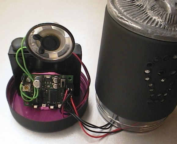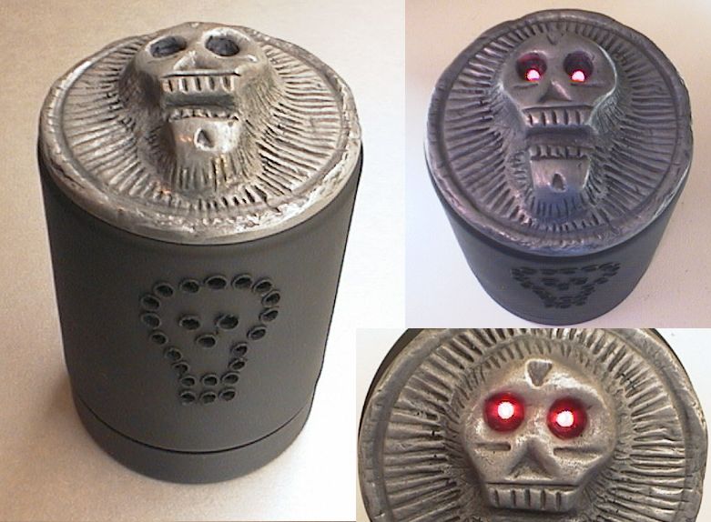The skull sculpture was made from modelling clay - the type that bakes hard in the oven. It's a metallic grey colour. After baking It was drilled with two 3mm holes, and two small high-brightnessLEDs glued in for eyes with a 390 ohm resistor glued onto the LEDs. The container was a clear plastic screwtop jar. Holes were melted in it in the shape of a skull using a soldering iron, these act as a "speaker grille". More holes were made in the top to mount the little "tact style" pushbutton under the skull and wires to the LED eyes. Some silicone was used to glue it together and still provide some stretch so the skull can move a little to press the button. It was then sprayed with matte black paint.