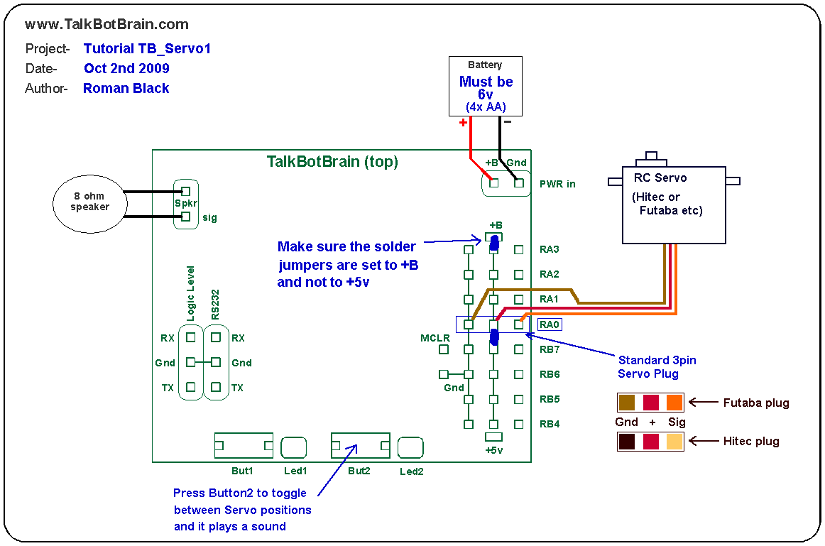 Program the .HEX file into the PIC as you normally do. This can vary slightly depending on which programmer you use. If you need to manually set the PIC config fuses these should be set to; _BODEN_OFF _PWRTE_ON _WDT_OFF _LVP_OFF _MCLRE_OFF _HS_OSCOnce the new firmware has been programmed, pressing Button2 will alternately play sound0 and sound1, even with no servo connected. Step 3; Prepare the TalkBot hardware for the servo Turn the TalkBot over and check that the 2 solder jumpers are set as shown in the diagram, this connects the middle 8 pins to +B (battery) instead of +5v. This is required because the RC servo will plug into the pins and the servo needs battery power, not +5v power.