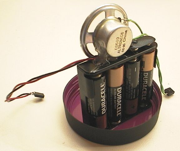 The skull sculpture was made from modelling clay - the type that bakes hard in the oven. It's a metallic grey colour. After baking It was drilled with two 3mm holes, and two small high-brightnessLEDs glued in for eyes with a 390 ohm resistor glued onto the LEDs. The container was a clear plastic screwtop jar. Holes were melted in it in the shape of a skull using a soldering iron, these act as a "speaker grille". More holes were made in the top to mount the little "tact style" pushbutton under the skull and wires to the LED eyes. Some silicone was used to glue it together and still provide some stretch so the skull can move a little to press the button. It was then sprayed with matte black paint.