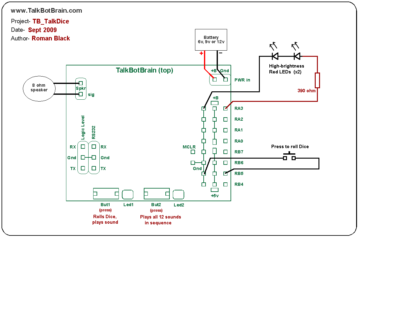 Click here for TB_TalkTemp Schematic. The .zip file (see up above) contains the full project; the C source, hex file, sound libraries, schematic etc. All you need is a Talkbot-battery-speaker and a DS1820 sensor and a 10k resistor. The sound library is just a male computer voice but you can load your own voice in if you prefer. TB_TalkDice.zip This project is a talking "Dice". It was made as a Halloween project and also to be used for playing board games. When the skull is pressed it "rolls the dice" and makes a random number from 1 to 6. Then it speaks the number, plays a random scary movie sound, and speaks the number again. A cool feature is that it then flashes the skull's eyes for the number that was rolled, ie 1-6 flashes. It does this for 2 minutes after the dice was rolled. This is to reduce arguments haha! It will operate from 6v, 9v or 12v and uses power saving mode when not is use so it only consumes about 150uA unless speaking.
