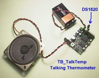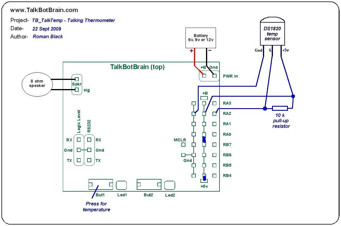 All TalkBotBrain source code is written in C language using the MikroC for PIC Compiler Official TalkBot firmware (These .ZIP files contain the firmware, and additional instructions) TalkBot_Slave1 This is the standard firmware installed in all new TalkBots. Slave1 firmware will download Sound Library files from PC via serial at 19200 baud, play up to 256 sounds, control up to 8 RC servos. It accepts 1byte and 2byte serial commands at 19200 baud. See the other TalkBot pages for more information about the standard Slave1 firmware. TalkBot_Slave2 This is identical to the Slave1 firmware but has one difference; It accepts serial commands at 2400 baud (not 19200 baud). This is more suitable when connecting a TalkBot to be controlled by older microcontrollers like BasicStamp1 etc. It is also more suitable when the TalkBot is mounted remotely and the serial commands are sent via very long wires. TalkBot_Slave3 Slave3 is the 8-button slave, sound only. Slave3 does not control RC servos, it is a sound player only. This is a simplified TalkBot which is used when you need something to just play 1 to 8 sounds, controlled by 8 switches or buttons. It requires that 4 pull-up resistors be added to the 4 PORTA pins. Sound Library files can still be downloaded from the PC at 19200 baud (like all these slaves). TalkBot_Slave4 Slave4 is the 4-button slave, sound only. Slave4 is identical to Slave3, but will only play 1 to 4 sounds, controlled by 4 switches or buttons. It does not require pull-up resistors on the 4 buttons as they are on PORTB. TalkBot_Slave5 Slave5 is the parallel binary 8-wire slave, sound only. Slave5 will play up to 255 sounds. It is controlled by a parallel binary command on its 8 pins. You just send a binary number to select the sound you wish to play. It can be controlled by less than 8 pins if you connect the unused pins to ground. TalkBot_Slave6 Slave6 is the random sound player slave. Slave6 is controlled by one switch or button, and will play 1 of 256 sounds. The sound will be randomly chosen from any of the available sounds. TalkBot_Slave7 Slave7 is the sequential sound player slave. Slave7 is controlled by one switch or button, and will play 1 of 256 sounds. The sound will be the next sound, and after all sounds are played it loops back to the first sound. User firmware * Watch this space * TalkBot projects TB_TalkTemp.zip This project is a talking thermometer. It senses the temperature using a DS1820 sensor from Dallas Semiconductor. This sensor outputs the temperature in degrees celcius, and the TB_TalkTemp speaks the new temperature every time it changes more than 0.5'C. It also speaks the temperature anytime a button is pressed. It will operate from 6v, 9v or 12v and uses power saving modes so it only consumes about 150uA unless speaking.